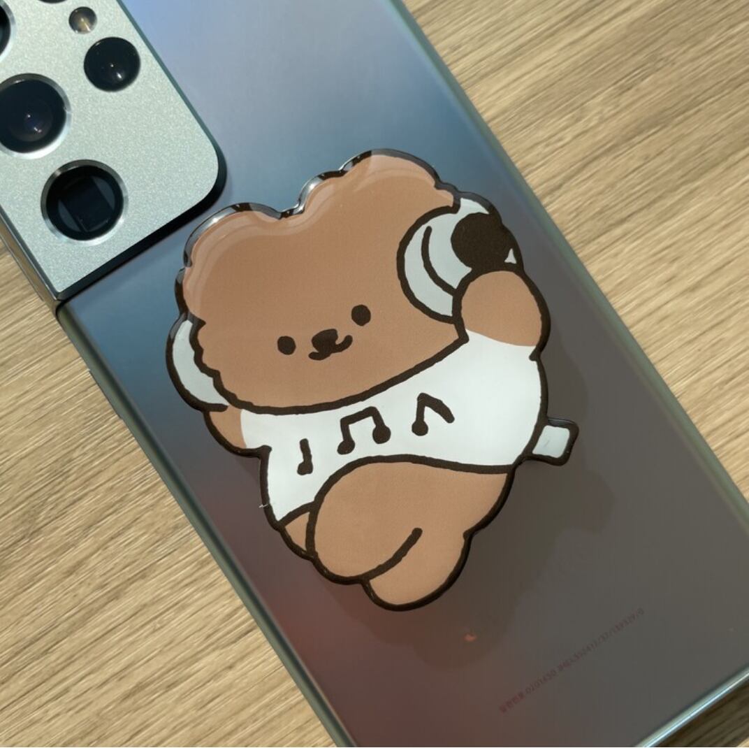 くまのパムゴムが楽しそうに音楽を聴いている姿が愛らしいスマホホルダーです。